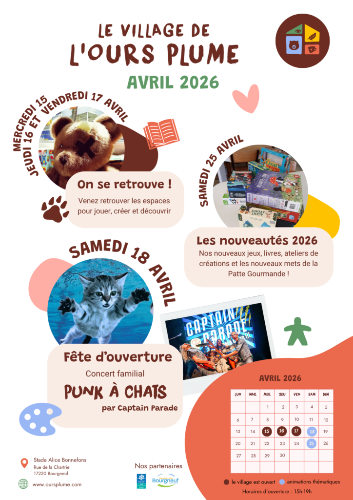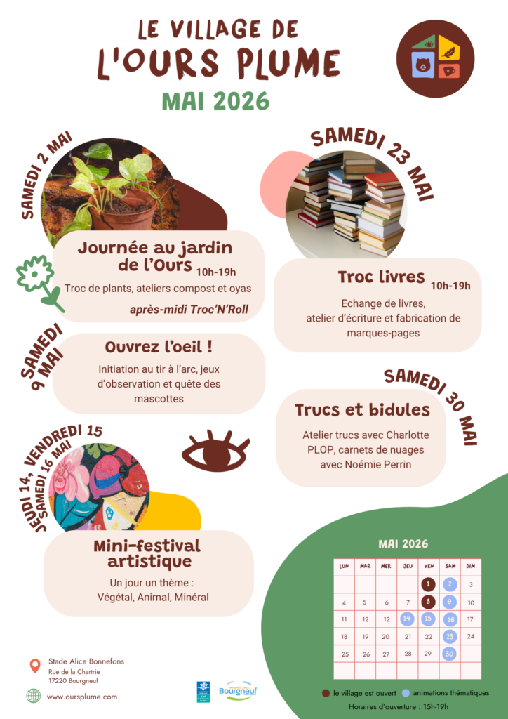 Le village de l’Ours Plume est situé Stade Alice Bonnefons, rue de la Chartrie, 17220 Bourgneuf